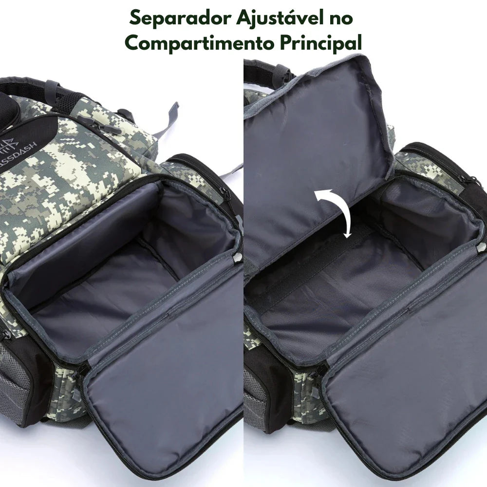 A Mochila de Pesca ProTackle Bassdash Camuflado 40L foi projetada para pescadores exigentes que precisam manter tudo ao alcance das mãos. Com amplo espaço interno e compartimentos bem distribuídos, acomoda até 3 caixas 3600, garantindo praticidade e agilidade em suas pescarias.